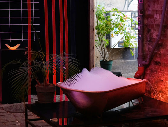 „Wiebke Müller und Tinka Remlinger entwerfen das Bühnenbild für die Räumlichkeiten des objekt klein a und interpretieren diese für fünf verschiedene Szenarien um. von Schwellen & Schleifen. von grauen Zonen & Hamstern auf Rädern. von der Sprache der Mode & und Sprache durch Mode. 12 Performer(Innen) – 5 Räume – 1 Rundgang Unorte werden beleuchtet, Hartes wird weich, Warmes, immer kälter.“